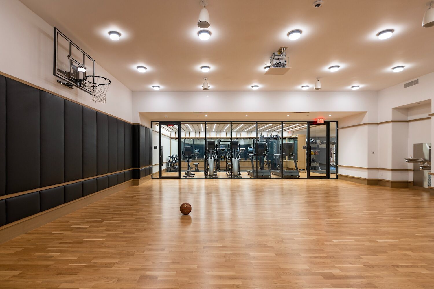 Perhaps the most surprising and delightful feature is right next door to the Fitness Center where the space can be set up as either a movie theatre or a sports court depending on the day— and audience.